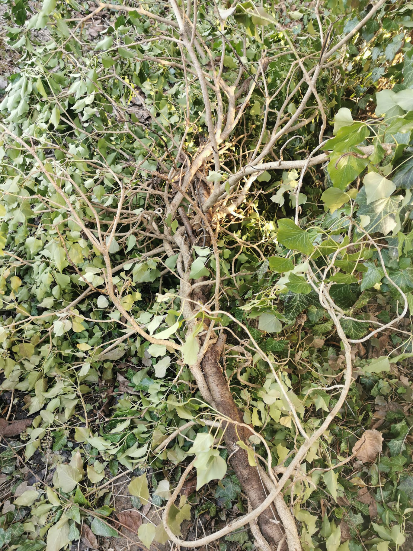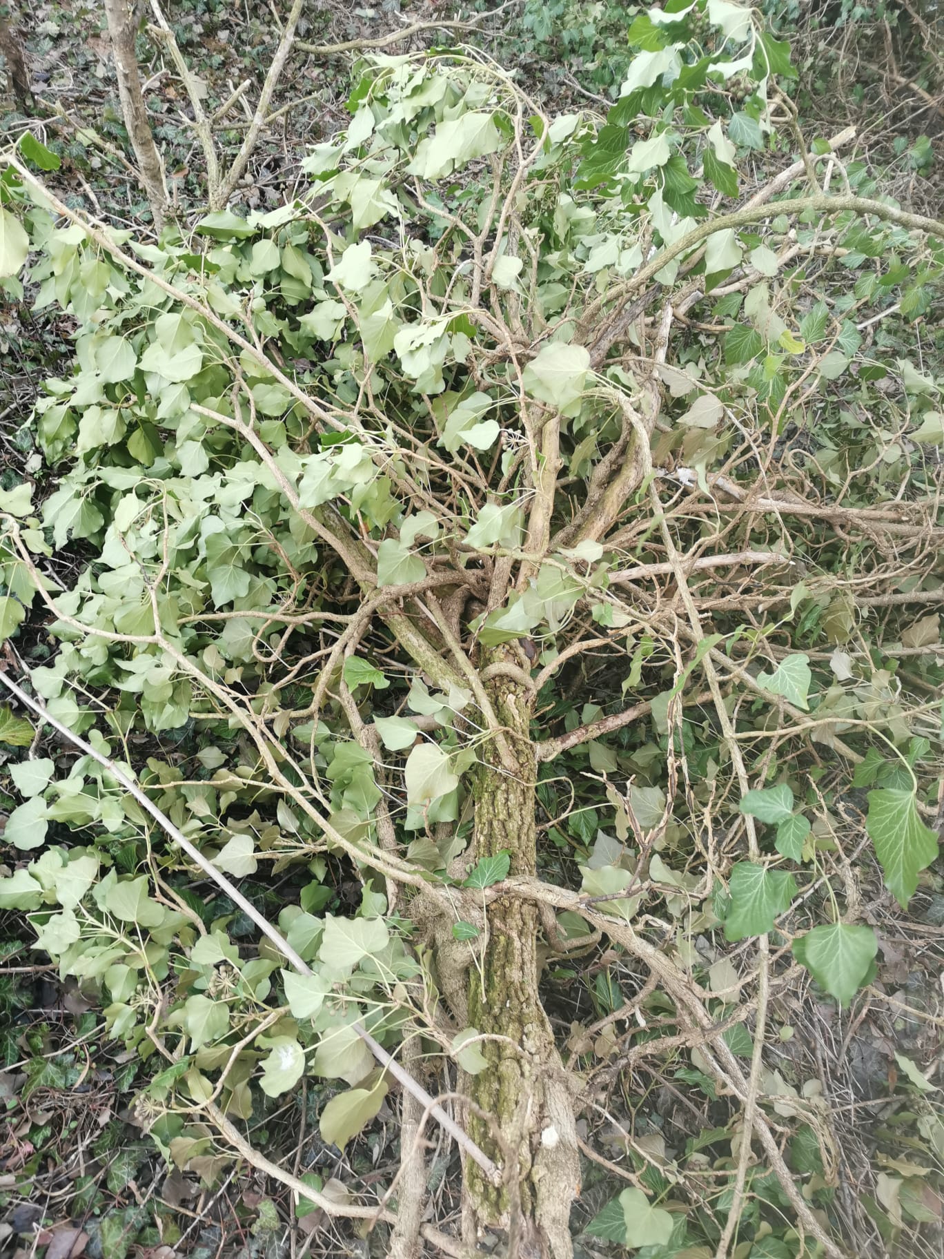 Variante 2 zeigt einen Faulbaum, der von einer alten dicken Efeuliane umwickelt ist, die jahrzehntelang gewachsen ist (ca. 2m)